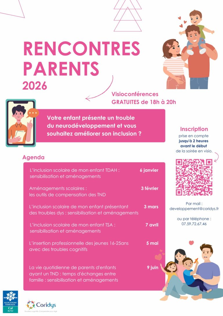 Coridys vous propose de se réunir le temps d’une soirée (visioconférences) autour d’un thème afin d’échanger, de comprendre et donner des pistes d’aménagements de la scolarité ou de la vie quotidienne.